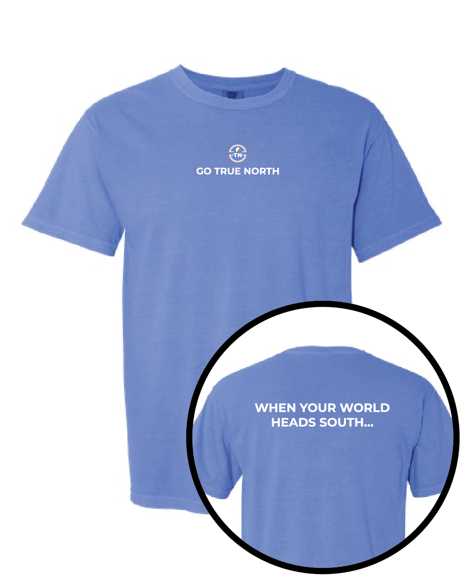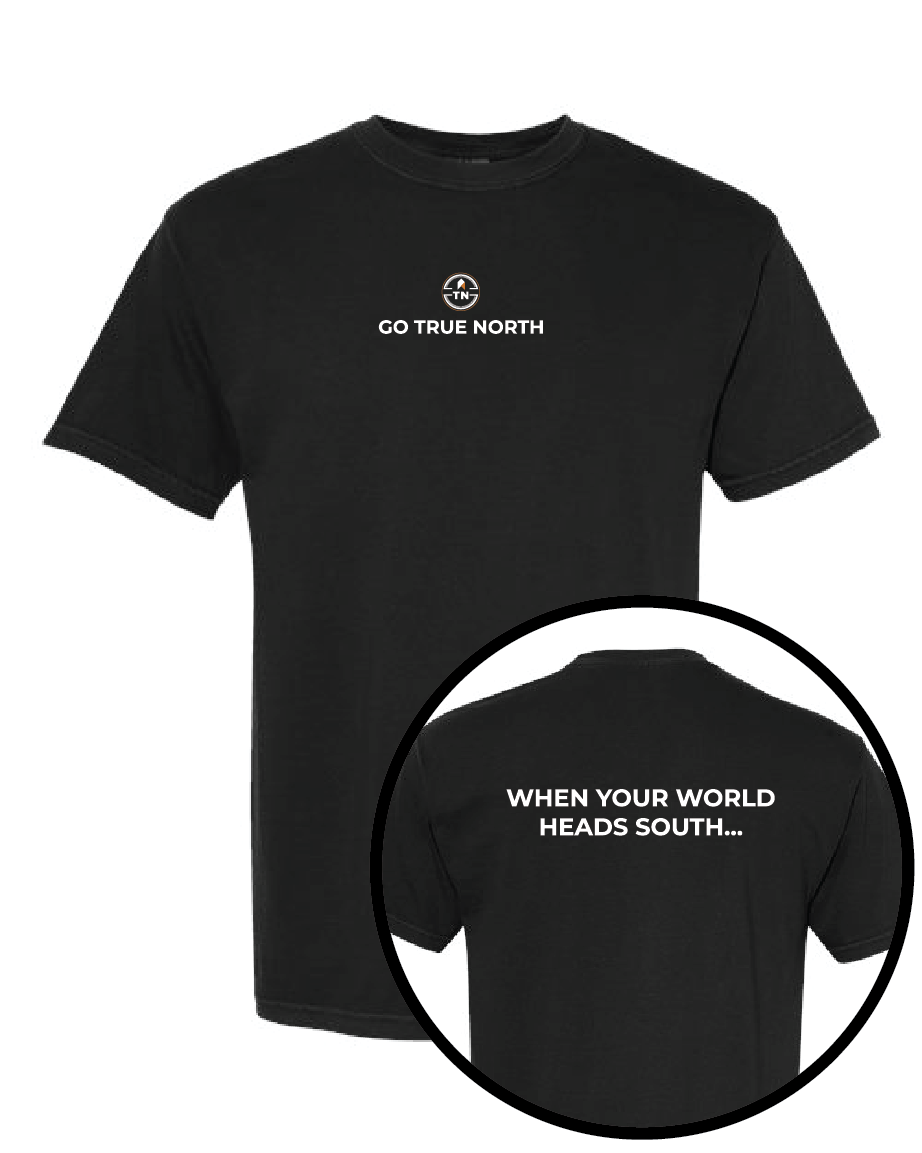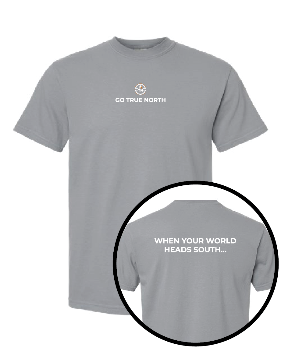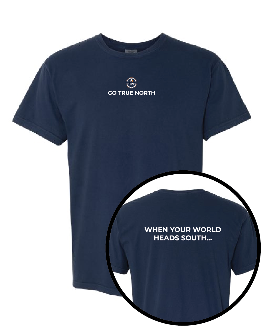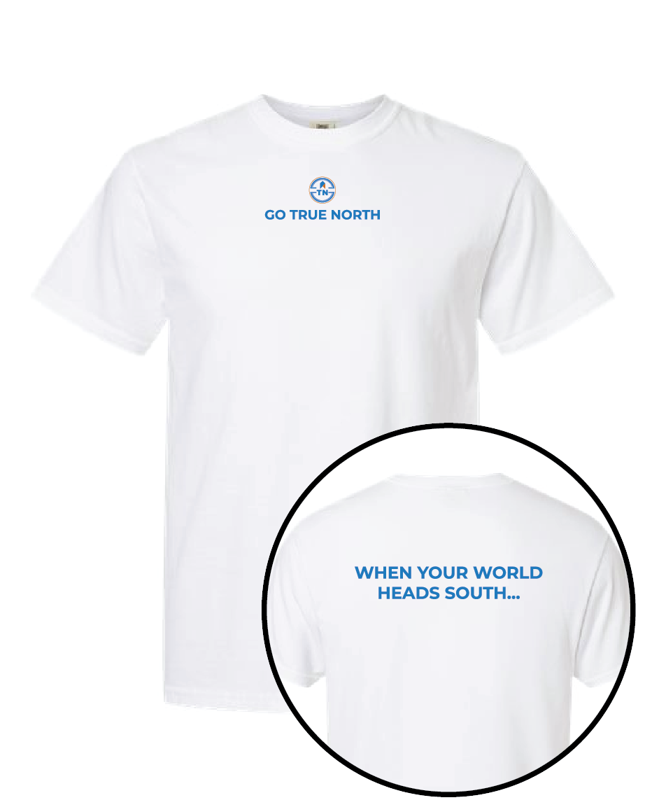 Black, Blue, Grey, & Navy - 6" White Heat Transferred "Go True North" on the Center Chest & 10" "When Your World Goes South" Upper Center Back