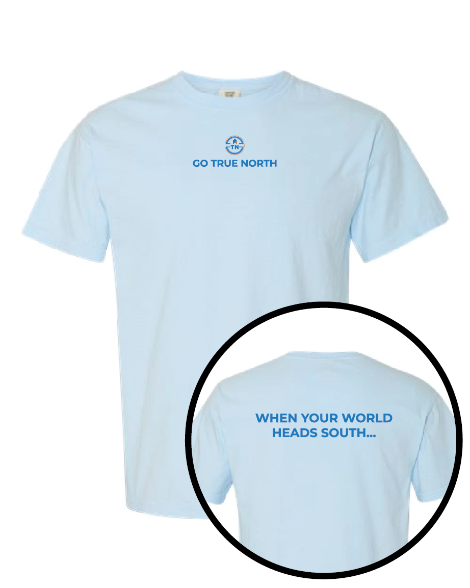 White & Light Blue - 6'' Blue Heat Transferred "Go True North" on the Center Chest & 10" When Your World Goes South" Upper Center Back