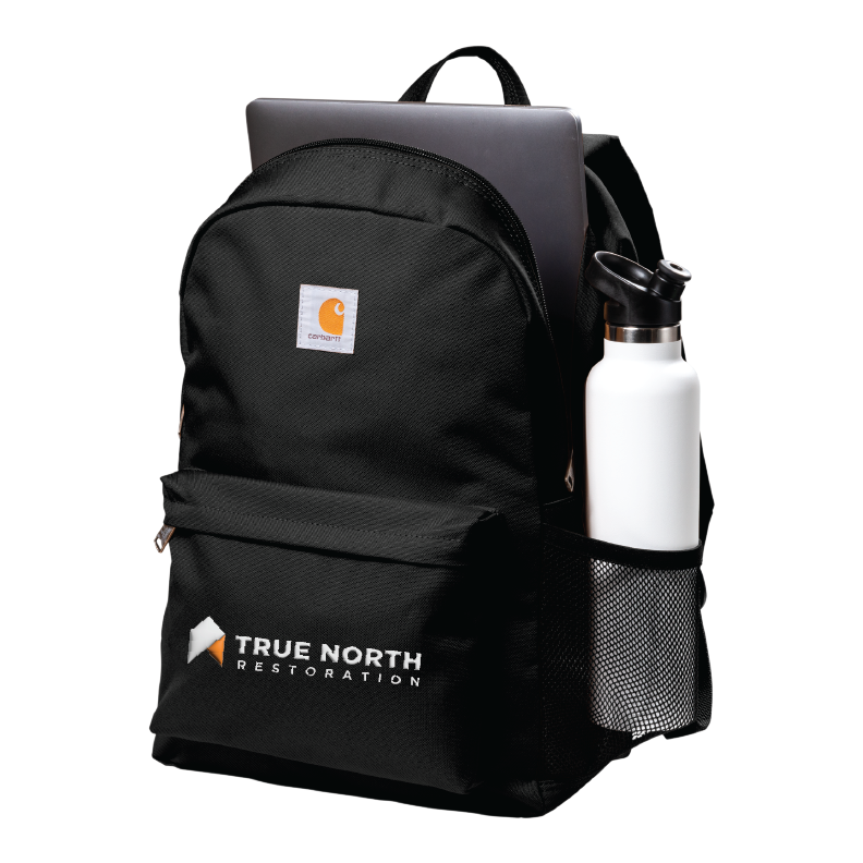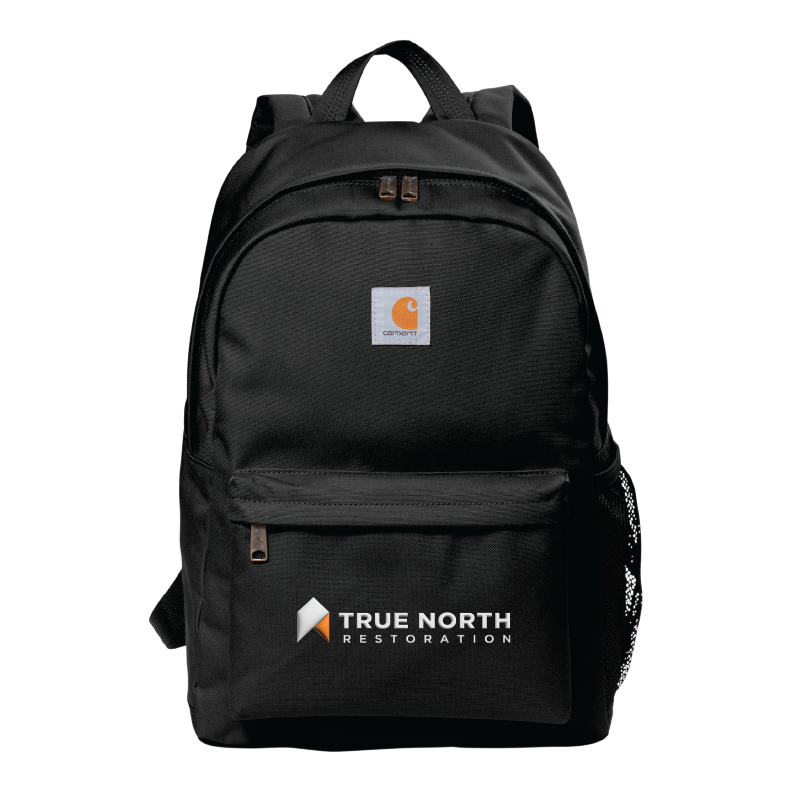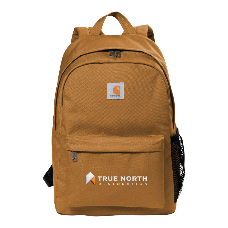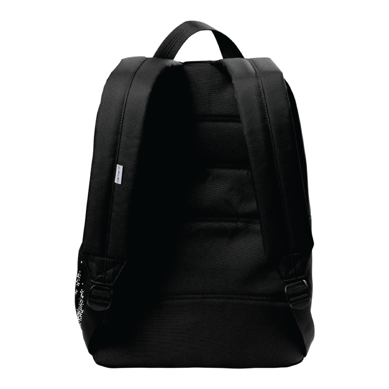 This pack is composed of 500D polyester material, boasting Rain Defender® DWR and providing comfort and waterproofing. A large main compartment has an elastic pocket, and the front includes a zippered pocket and two mesh pockets with a key fob. It also has a mesh side pocket and padded shoulder straps for extra comfort. 21L capacity, 17.5"h x 12"w x 6"l. 3.5" embroidered logo is on the front pocket.