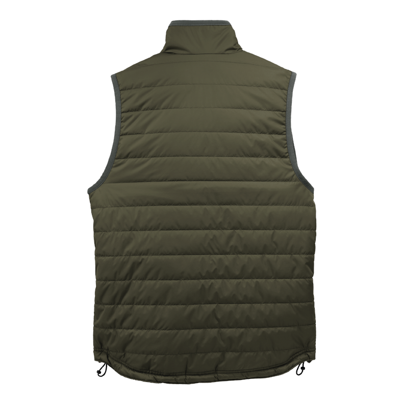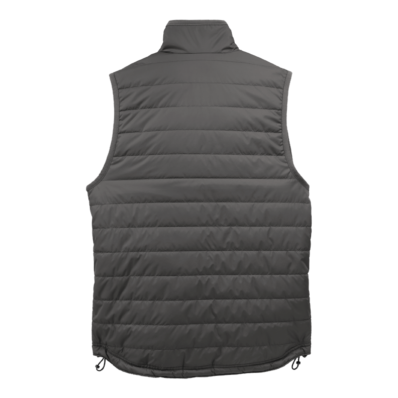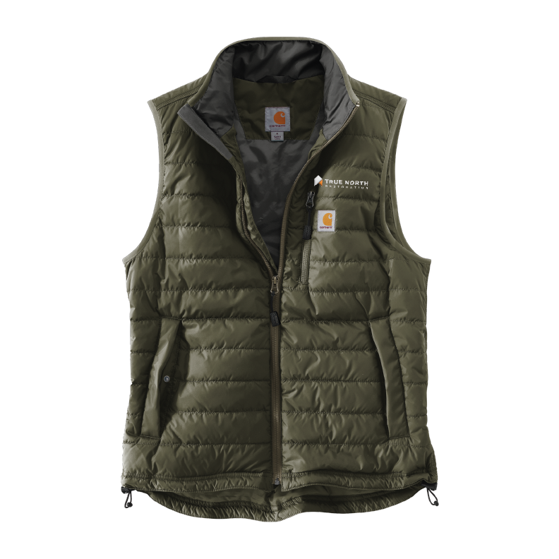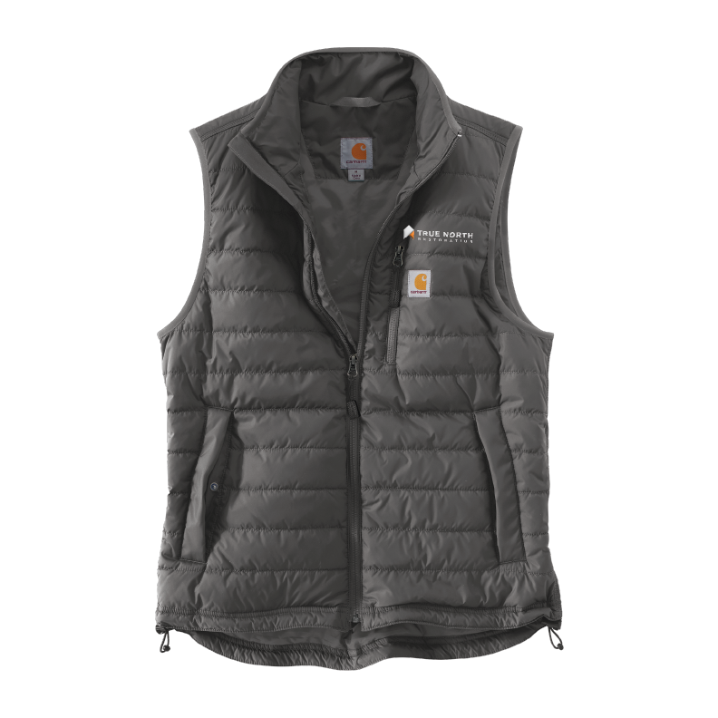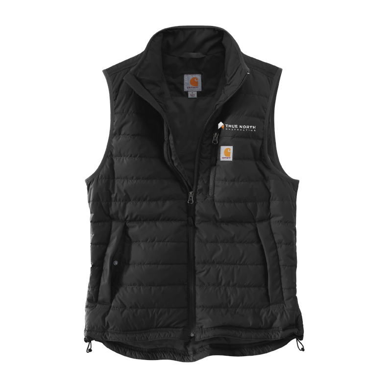 Constructed with a 1.75-ounce, 100% nylon Cordura® shell, the Gilliam Vest features Rain Defender® water repellent with Wind Fighter® wind-blocking technology and 100-gram polyester insulation. It is designed with a reverse coil center front zipper, zip-through collar, left chest map pocket, two hand pockets with hidden snap closures, two interior pockets, and adjustable drawcord drop tail hem with Carhartt-strong, triple-stitched main seams. The Carhartt label is sewn onto the chest pocket and the vest offers a relaxed fit.