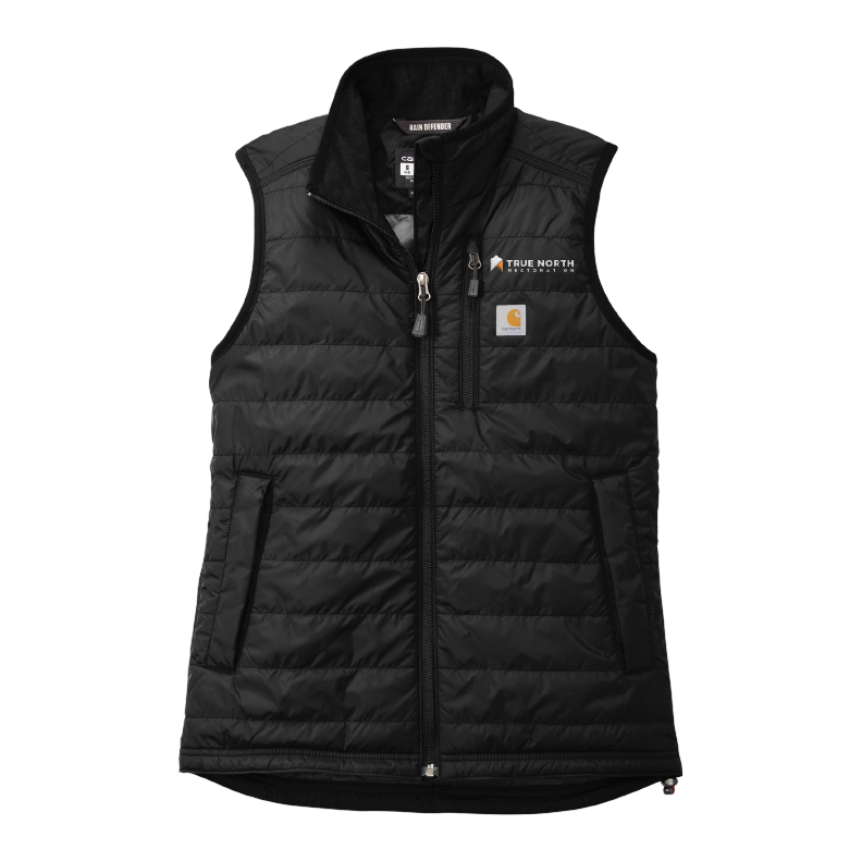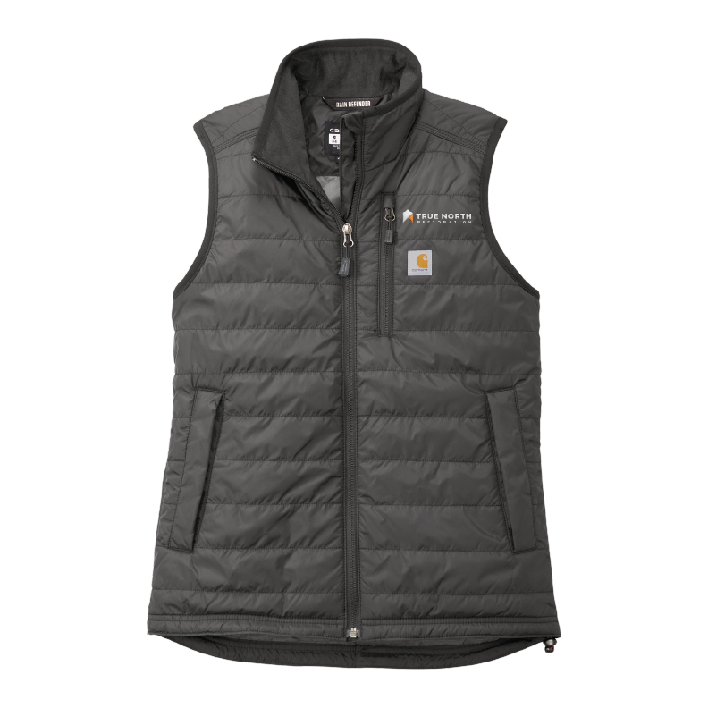 This vest is constructed with a 100% nylon Cordura® shell treated with Rain Defender® for water repellence and Wind Fighter® technology for wind resistance, plus a 100-gram polyester quilted insulation for comfort. It is equipped with a reverse coil center front zipper and zip-through collar, plus a left chest map pocket and two hand pockets with snap closures. Additionally, there are two interior pockets - one with a zipper and one with a hook-and-loop closure - and a drawcord adjustable drop tail hem. Made with Carhartt-strong triple-stitched main seams and a Carhartt label sewn onto the chest pocket, this vest is crafted for quality and durability.