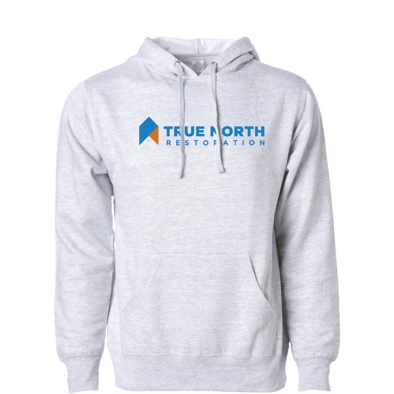 11" Heat Transferred Center Chest Logo. Constructed from 8.5 oz./yd² (US) 14.1 oz./L yd (CA) fabric, the True North Hooded Sweatshirt features a grey heather blend of 75% cotton and 25% polyester, with a 100% cotton face. Additionally, it offers a standard fit, a jersey lined hood, split-stitched double-needle sewing on all seams, twill neck tape, 1x1 ribbing at cuffs & waistband, metal eyelets, and a pouch pocket.
