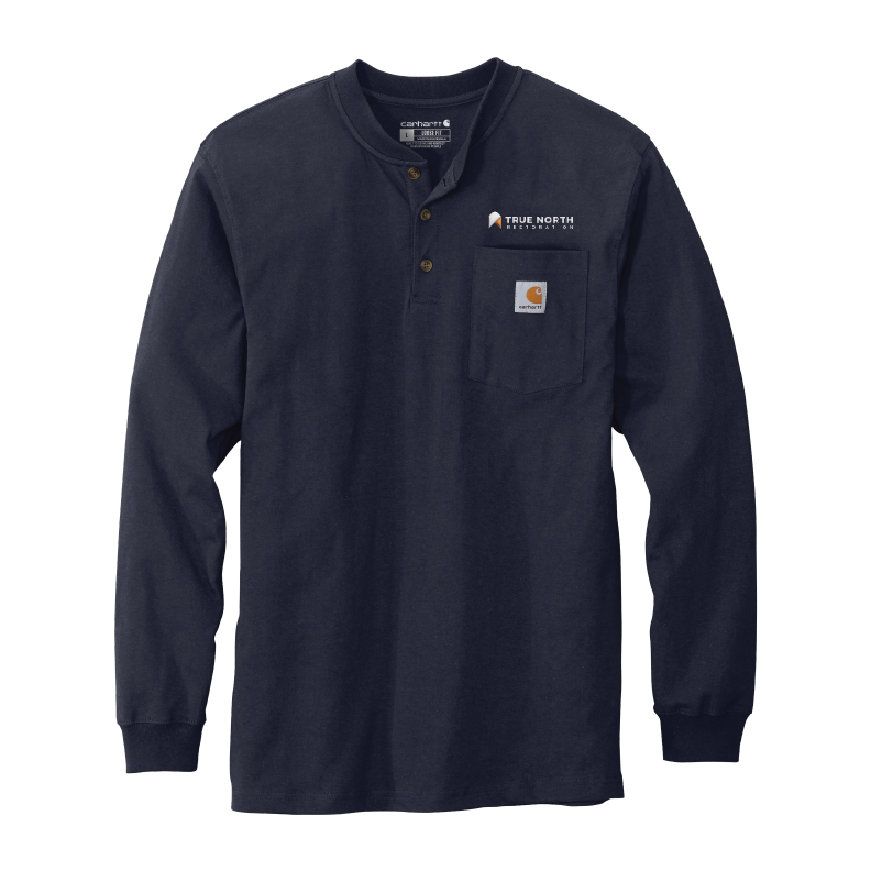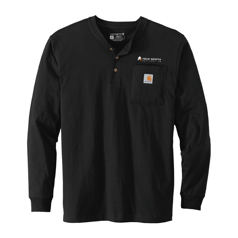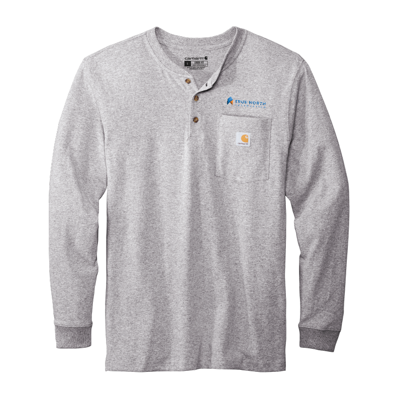 This long sleeve henley is constructed from durable 6.75-ounce, 100% cotton jersey knit and available in two additional fabric constructions, including 90/10 cotton/polyester jersey knit (Heather Grey) and 60/40 cotton/polyester jersey knit (Carbon Heather). This product features rib knit crewneck, Henley collar with three-button front, tagless neck label, left chest pocket, side-seam construction to minimize twisting, Carhartt label sewn on left chest pocket and rib knit cuffs in a loose fit.