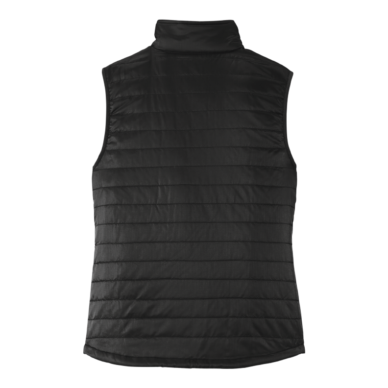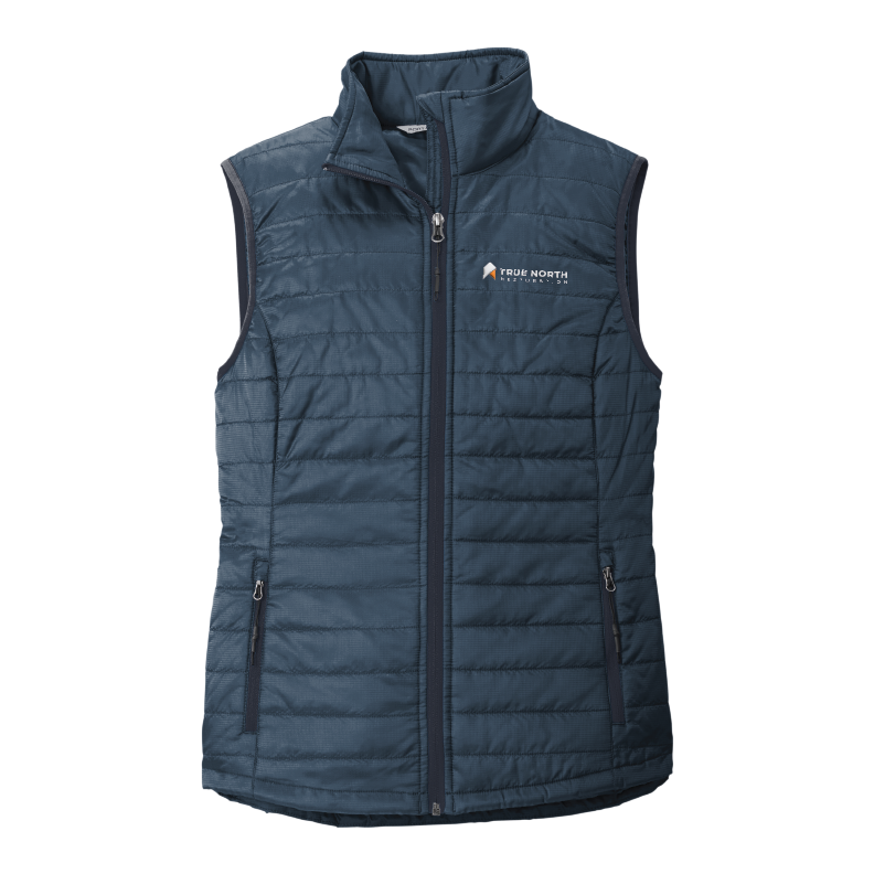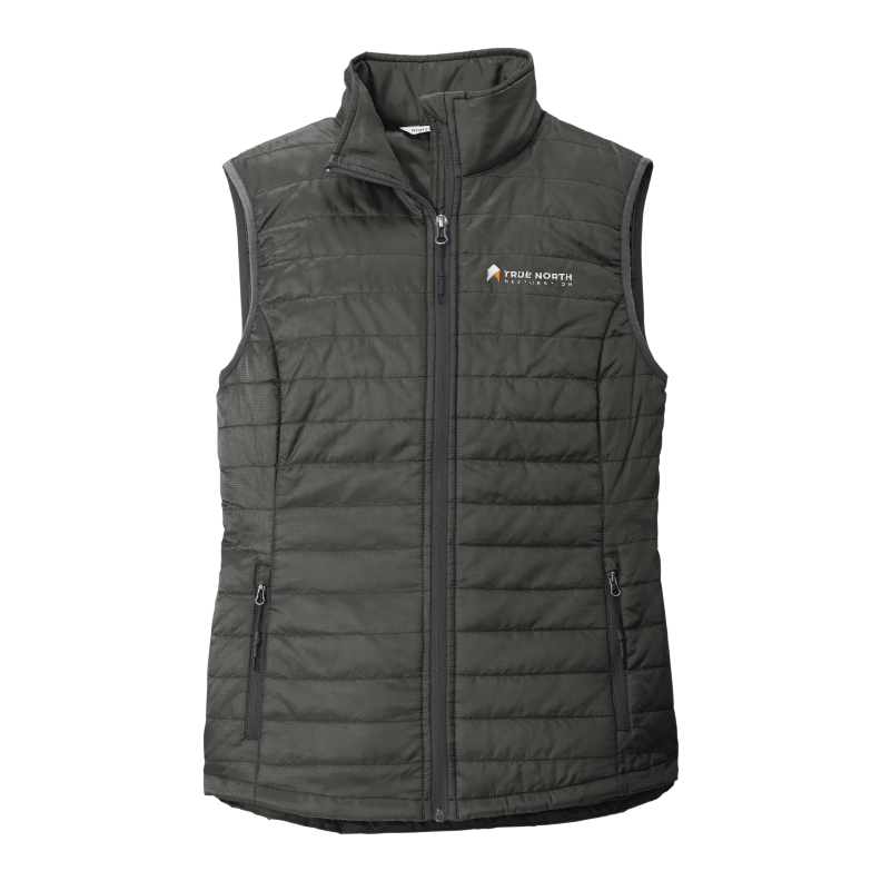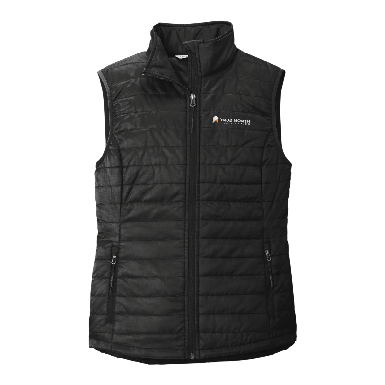 This True North Women's Puffer Vest has been crafted from a 100% polyester shell and insulated with 2.4-ounce polyfill. It also features front zippered pockets and reverse coil zippers, and is equipped with an adjustable locking drawcord and Port Pocket™ for embroidery access. Additionally, this vest is PU coated and has a water-repellent finish for water protection, and includes a carrying pouch.